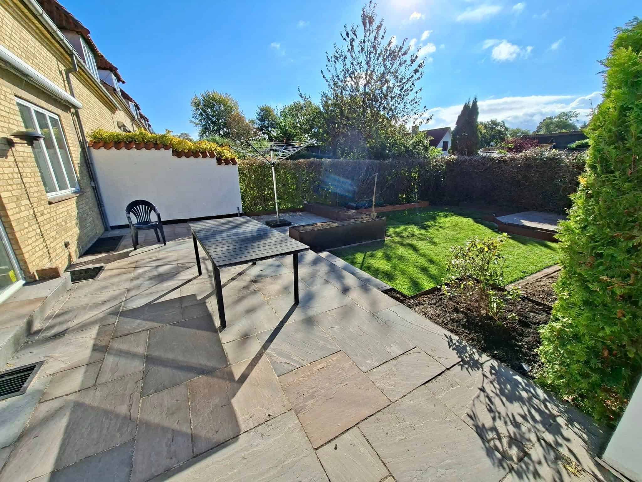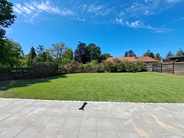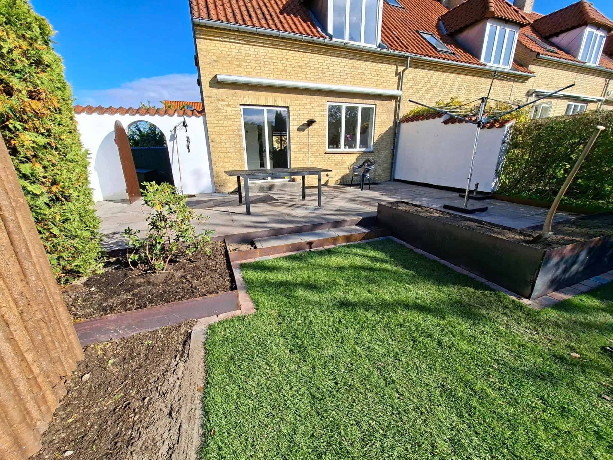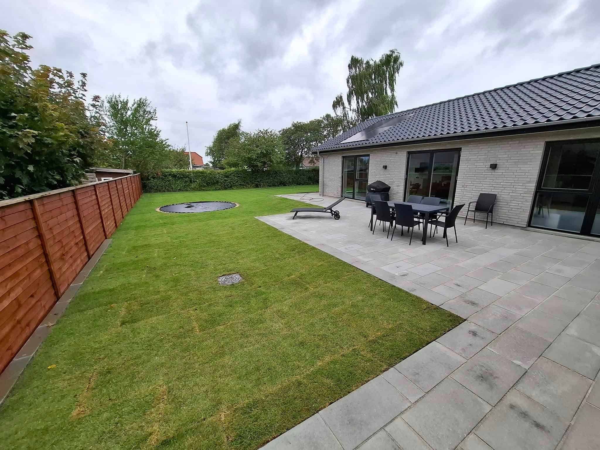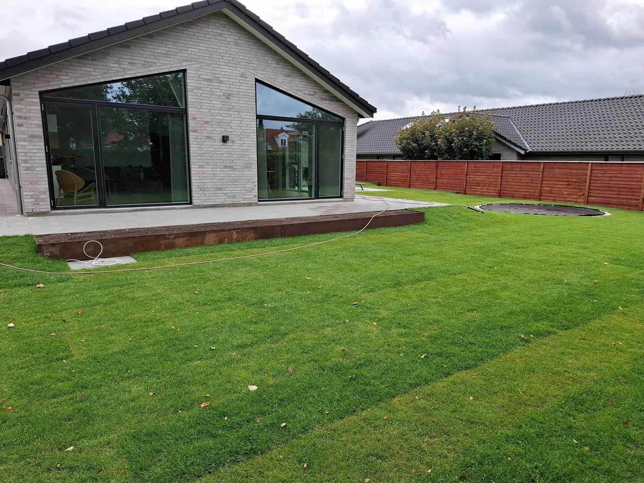Rullegræs i haven med nedgravet trampolin samt stålbed for enden af huset.