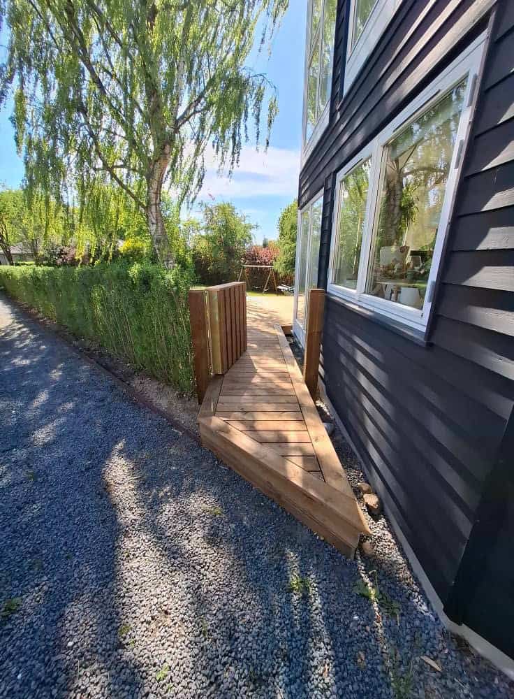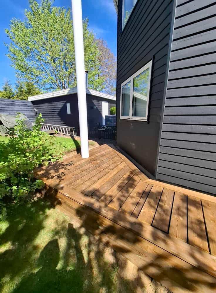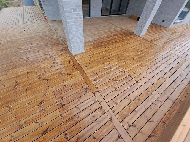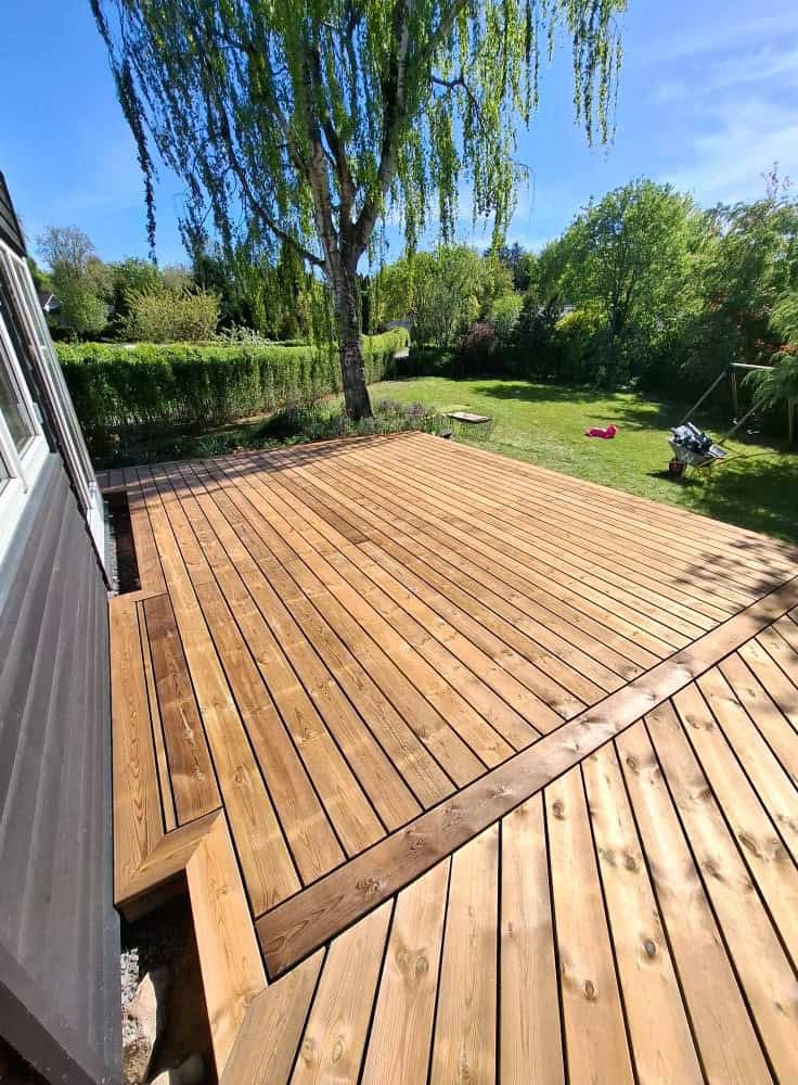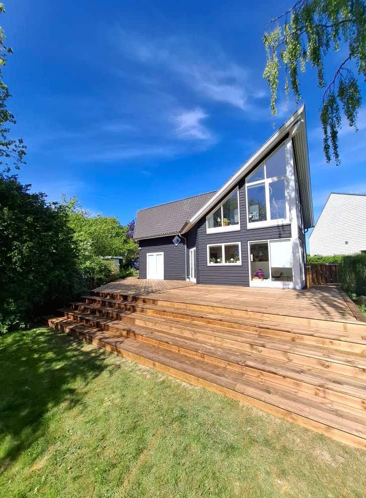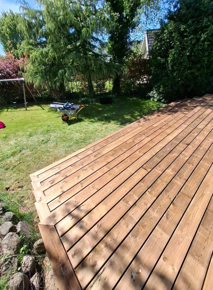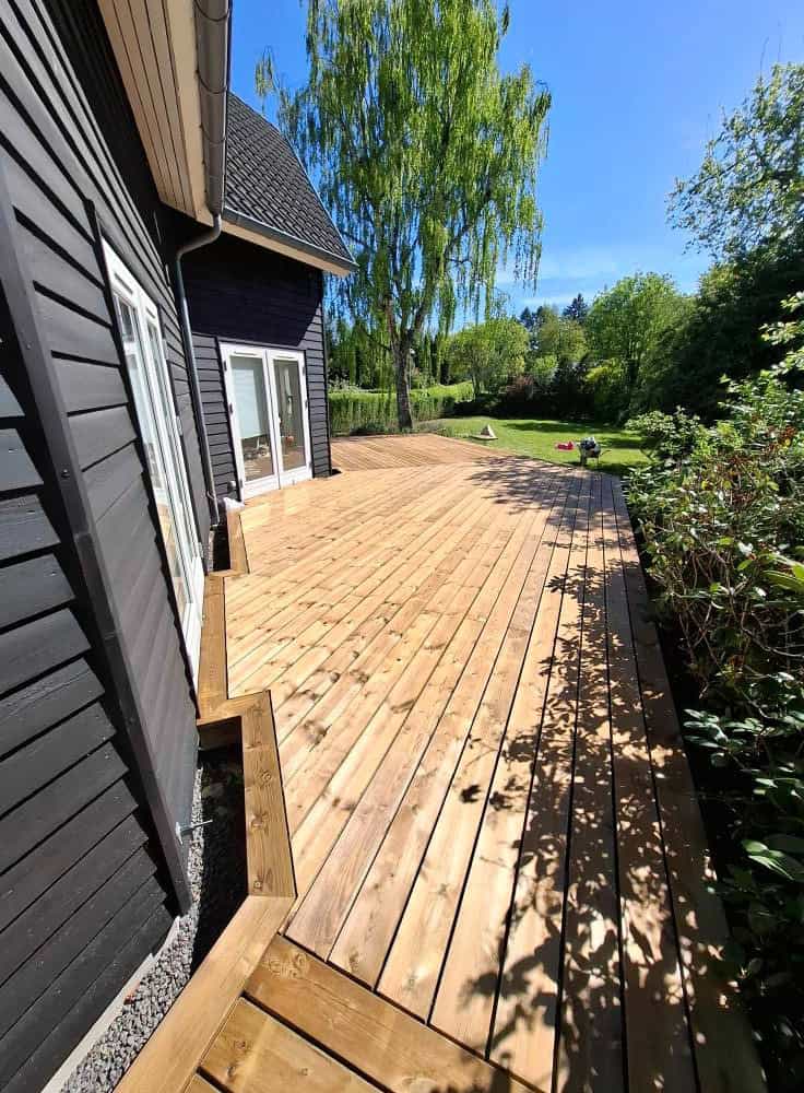 Her er der blevet brugt brunimprægneret brædder, med en masse skæringer lidt over 100 m2 med en dejlig stor trappe + en lille låge, brædderne er skruet på med skjulte skruer.
