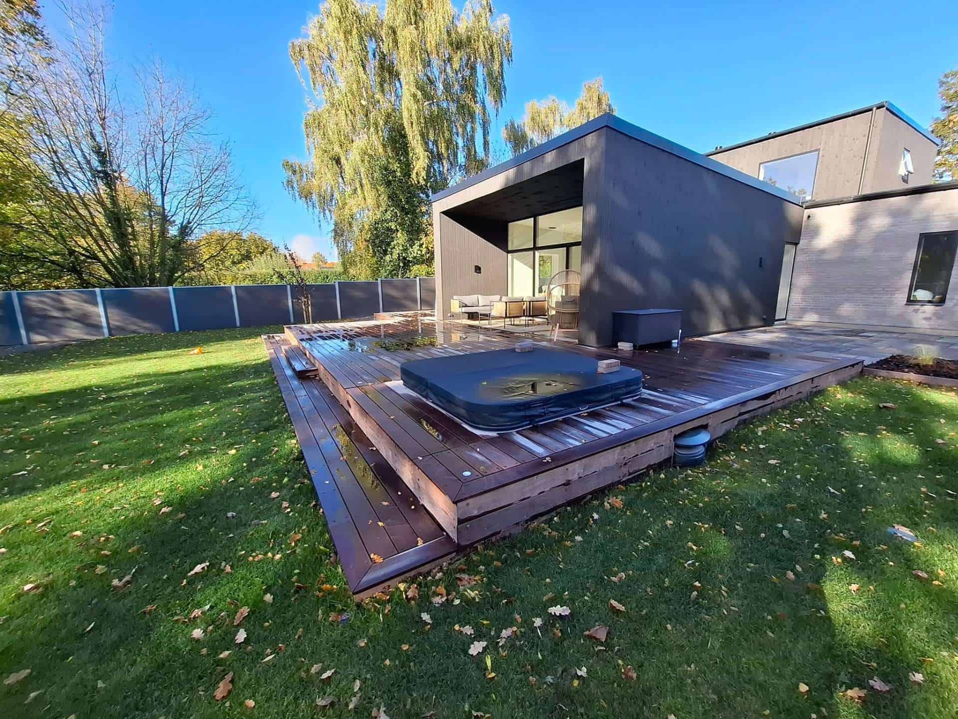 • 130 m2 træterrasse i IPE hårdttræ med udbygning til spabad